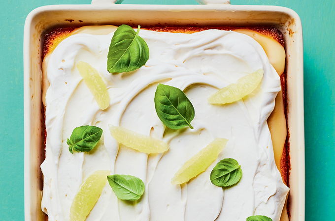 On appelle ce type de gâteau un poke cake, ce qu’on pourrait traduire par un gâteau troué. Le secret? À la sortie du four, on perce plusieurs trous dans le gâteau et on y verse une crème au citron qui va s’y infiltrer. Pour encore plus de fraîcheur, on étale de la chantilly aromatisée au basilic sur le gâteau.
