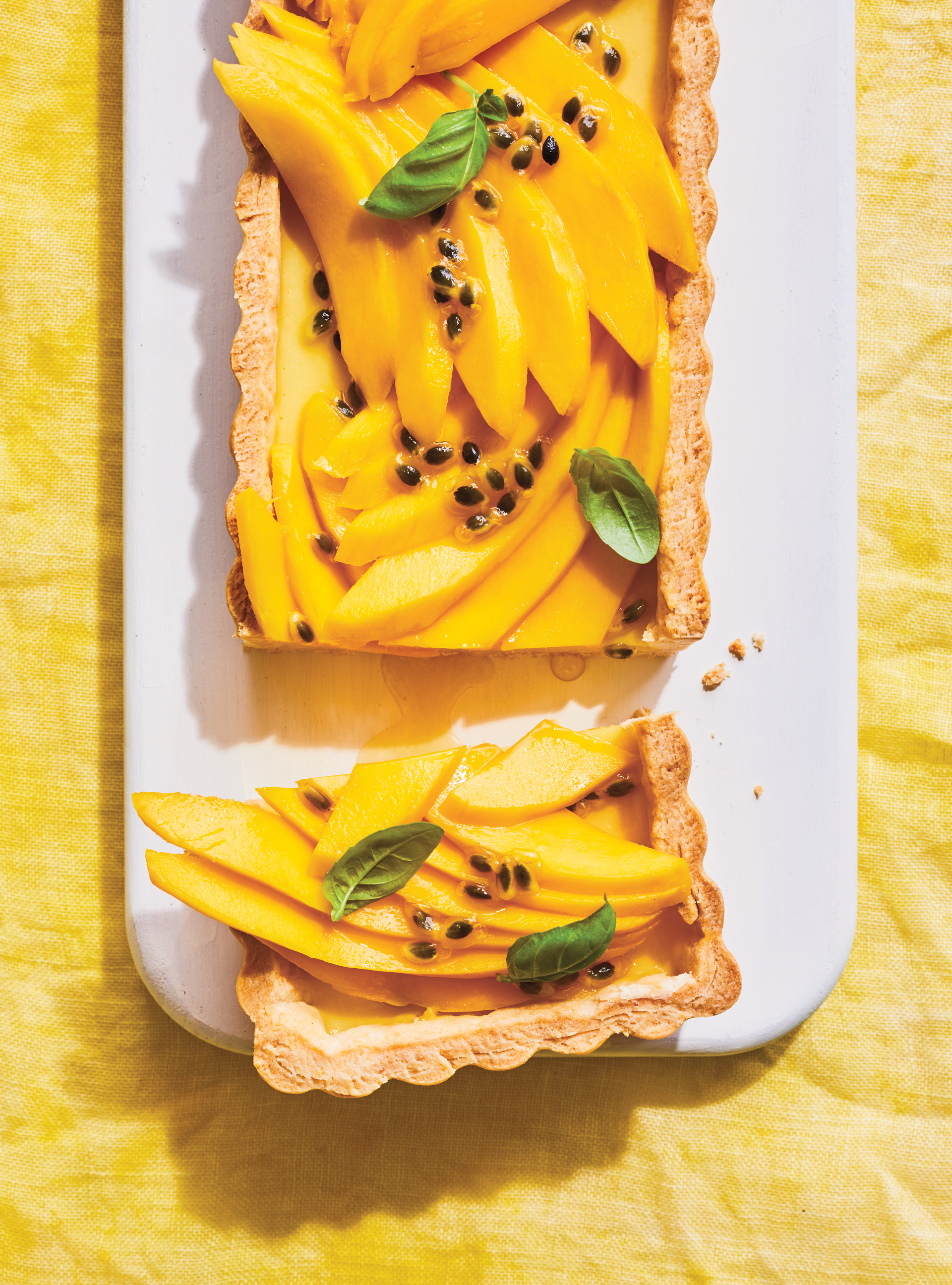 Retirer la tarte du moule et déposer sur une assiette de service. Répartir les tranches de mangue sur le crémeux. Arroser d’un peu de sirop et garnir de feuilles de basilic. Servir la tarte avec le reste du sirop.