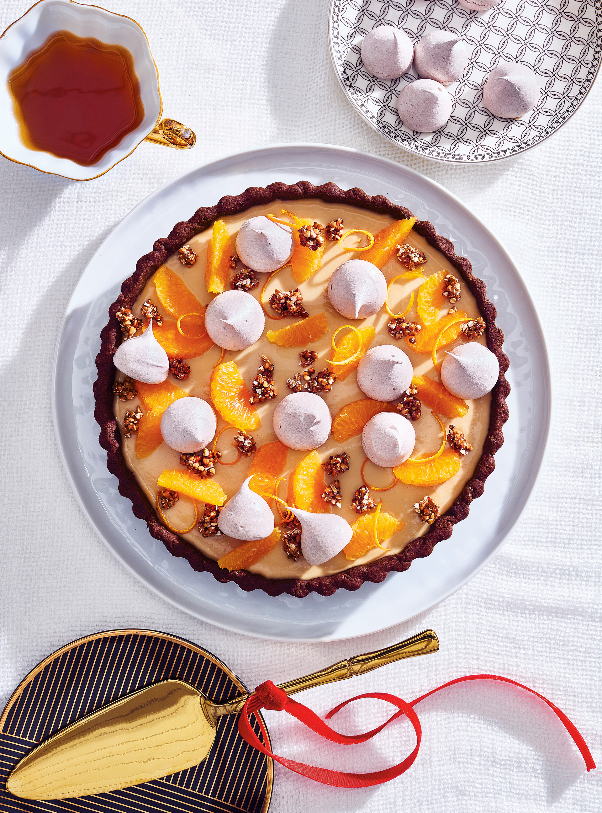 Cette magnifique tarte clôt le repas sur une note gourmande, où un mélange crémeux de chocolat blanc caramélisé est versé sur une croûte au chocolat. Les garnitures de sarrasin, de meringues et de suprêmes de clémentines créeront assurément un effet «wow» à table.